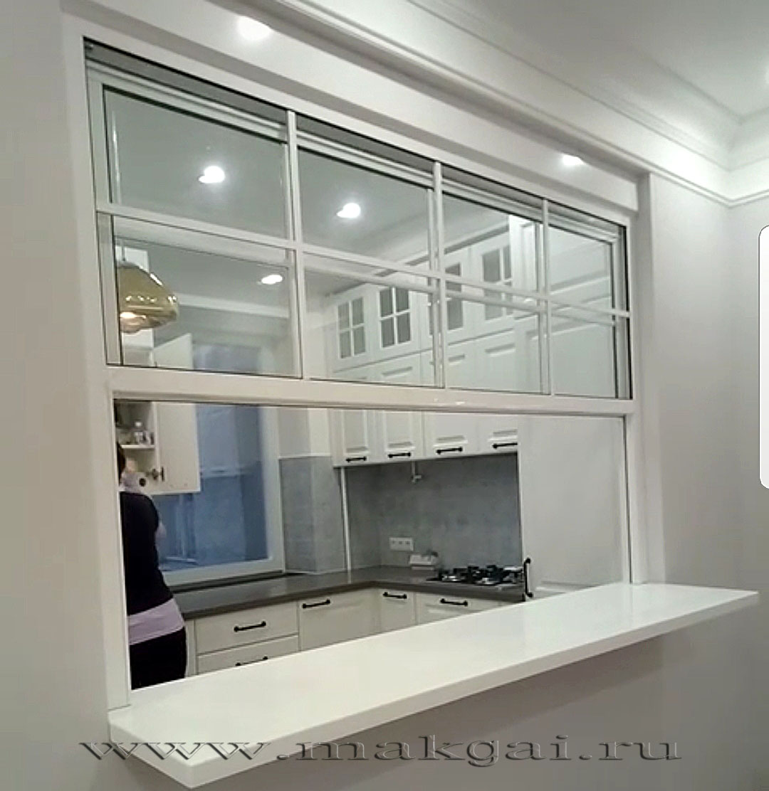 Преимущества, окно можно поставить непосредственно на плоскость столешницы или подоконника,то створка опускается непосредственно на столешницу или подоконник то есть до нижнего габарита окна. Плоскость столешницы или подоконника, при открытой створке, будет единая и ровная без стыков.